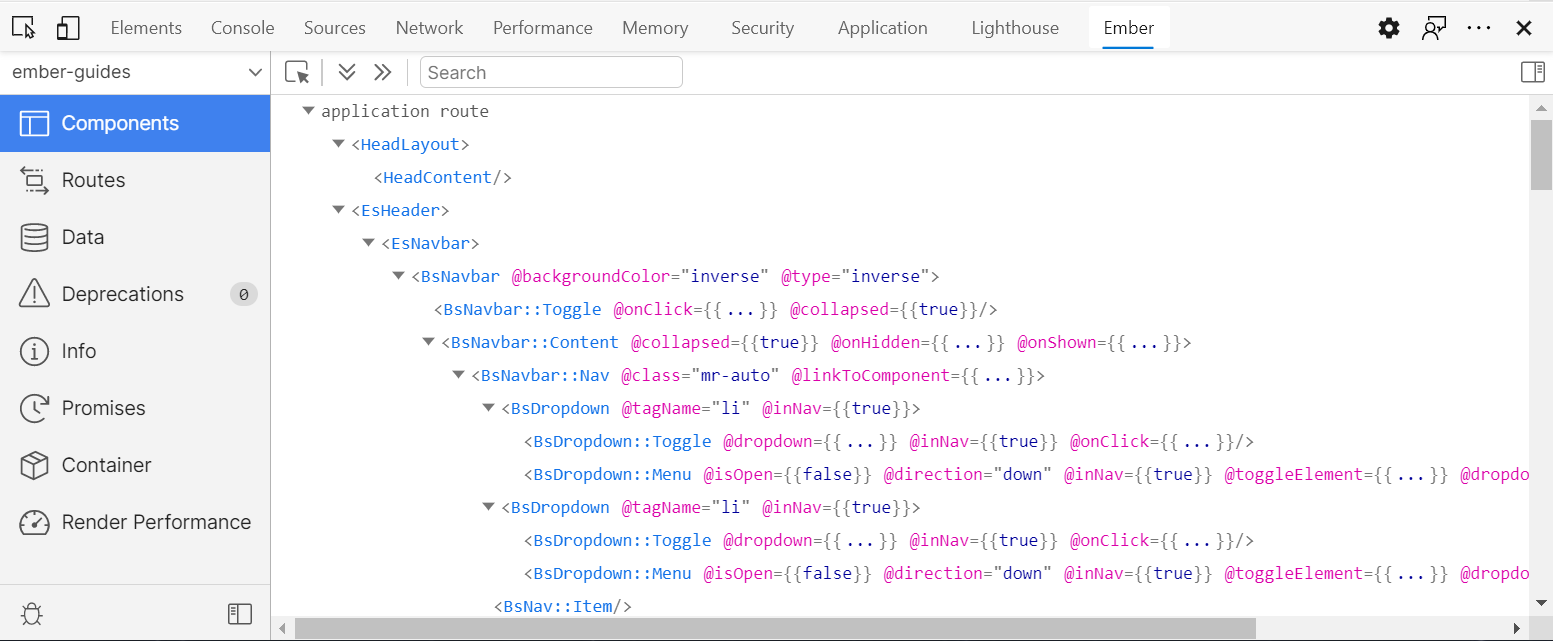 The Components tab displays a collapsible representation of the views and components that are currently being rendered. Selecting a component from the tree will open it in the Object Inspector.