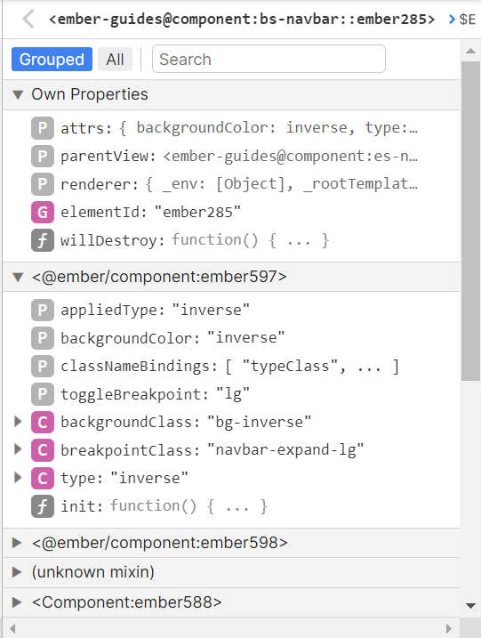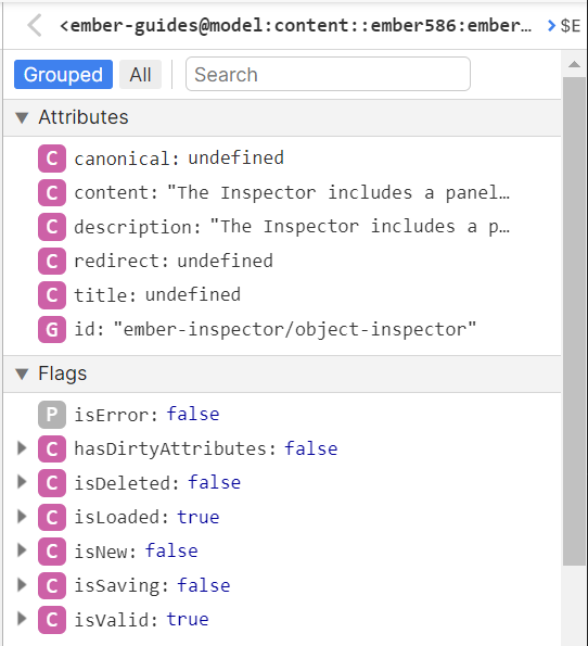 Some properties are not only grouped by inheritance, but also by framework level semantics. For example, if you inspect an EmberData model, you can see Attributes, Belongs To, Has Many, and Flags groups.