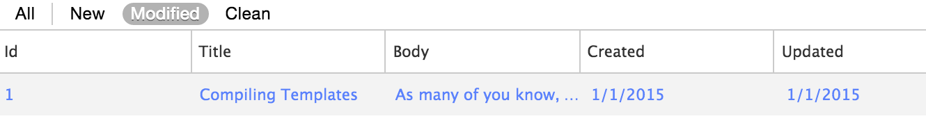 Each row in the list corresponds to one record. The first four model attributes are shown in the list view. Clicking on the record will open the Object Inspector for that record, and display all attributes.